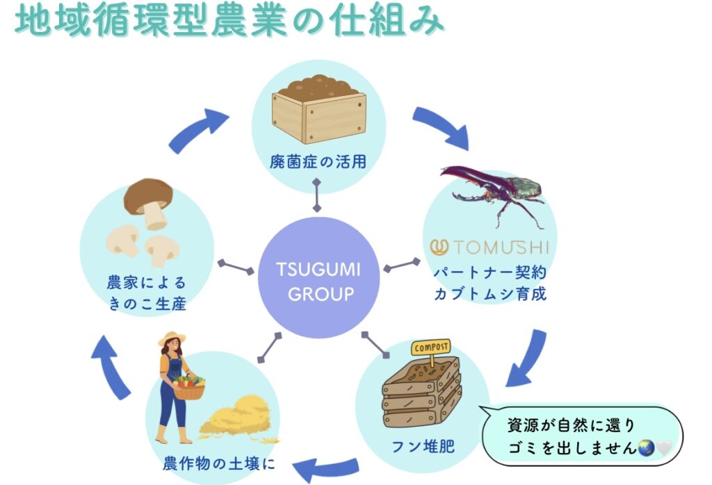 「きのこ栽培の副産物=廃菌床」を、カブトムシのエサとして再利用。