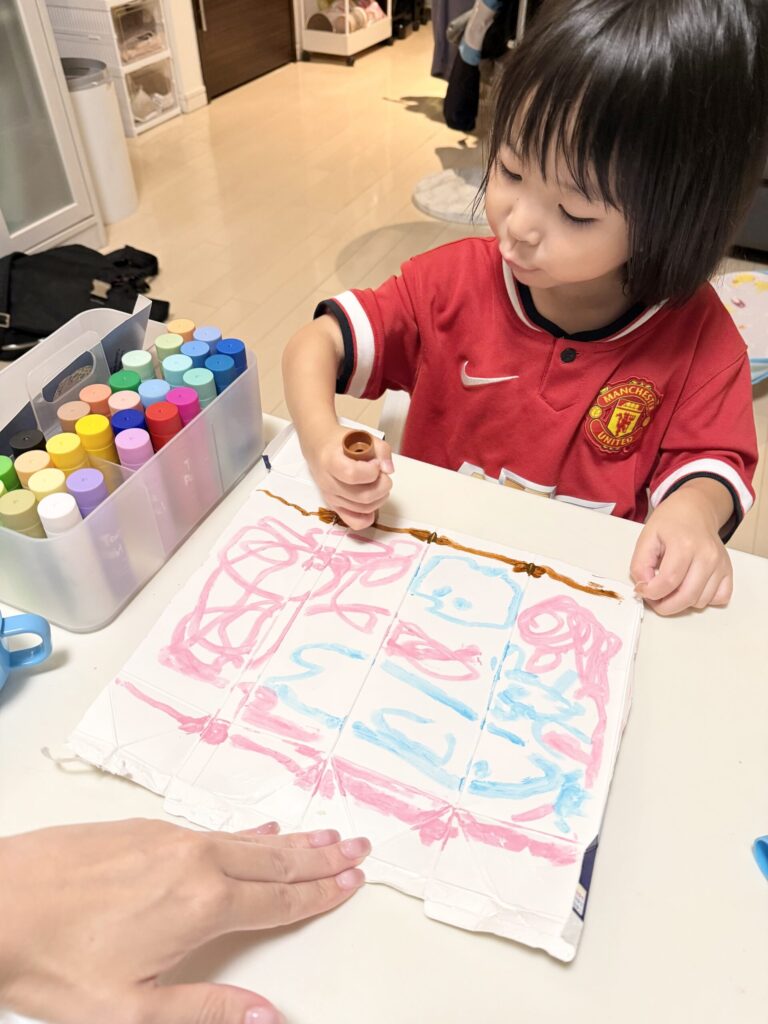 園のお当番で牛乳パックをチョキチョキすることにハマり✂️、家でもチョキチョキしてお絵描き🐙